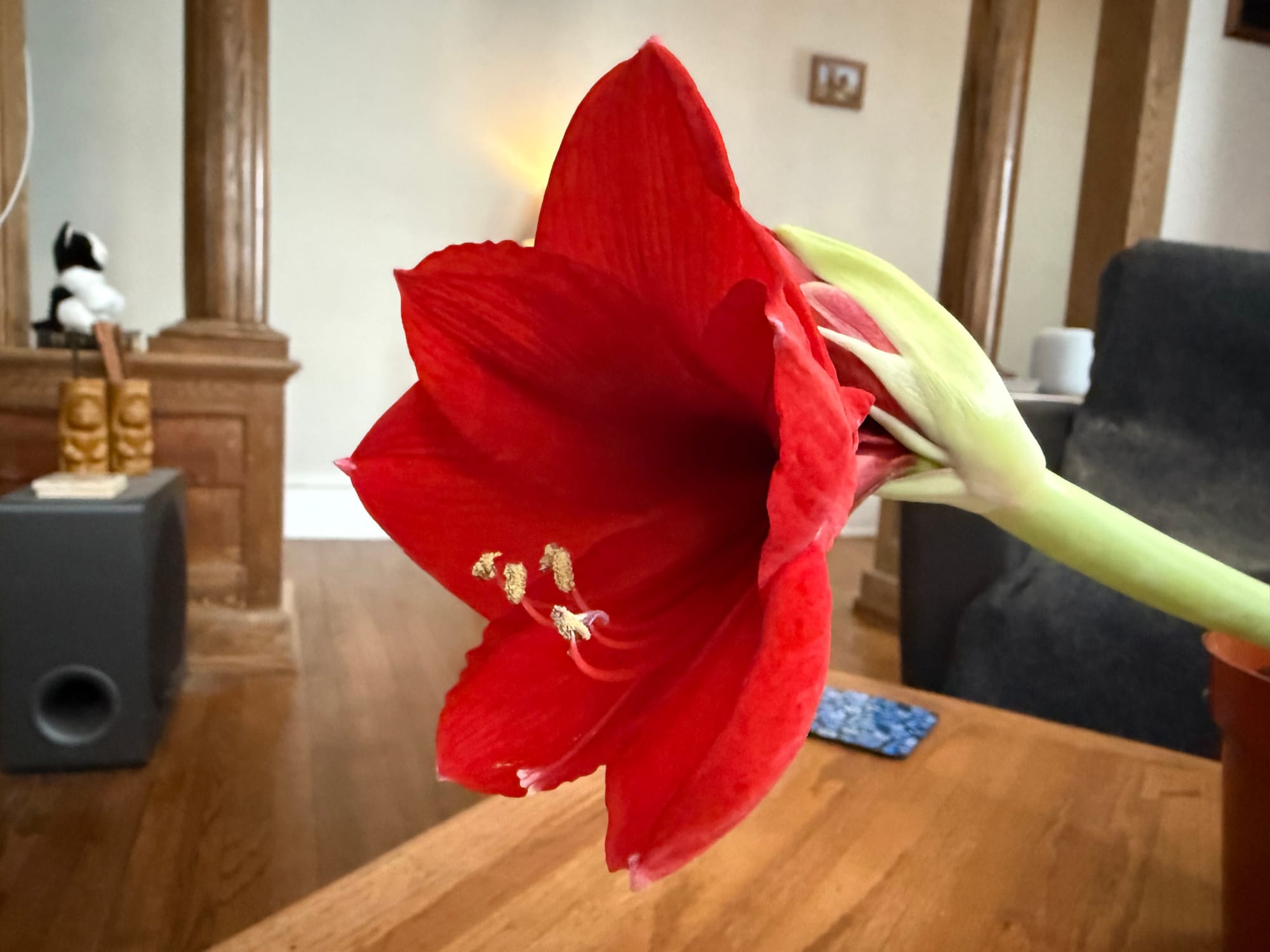 A day at Craig's Cruisers. Wine and books. Murphy watches from on high. Ellie sleeps. Tyr is blanketed in show. A gift Amaryllis blossoms.