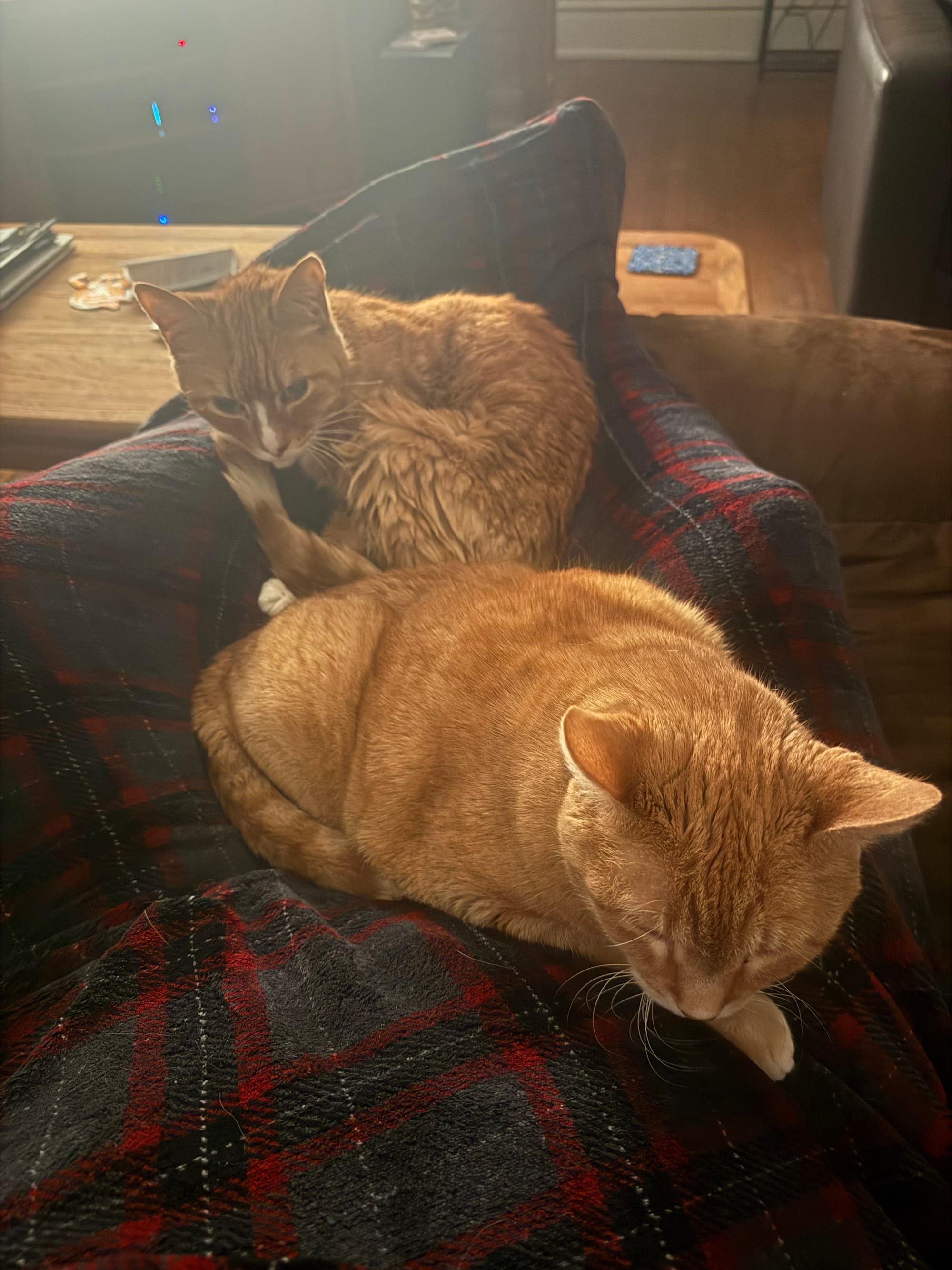 Clean enclosures; happy birds. Cocktails, a-woo hoo! Felines in repose. Macey with a blanket and a kiss. Fiona kneads me. Larry the Mouse (RIP) has a beautiful eldest daughter. Cade and his boys. Cade is all left feet. Tyr didn't bat an eyelash when I put his saddle pad on him.